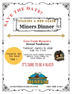 This highly anticipated event, “Staking a New Claim”, celebrates the rich history and vibrant Cave Creek community. It’s also the museum’s finest event of the season and its largest fundraiser of the year. This ever-popular event will be held at Harold’s Corral, which serves as the official sponsor.
