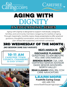 Foothills Caring Corps is hosting the third installment of its Aging with Dignity series on Wednesday, March 18, from 10–11 a.m. in the Town Council Chambers. This thoughtful series creates space for honest conversations, practical guidance, and trusted information about aging—helping individuals, caregivers, families, and community members feel more prepared, supported, and connected.